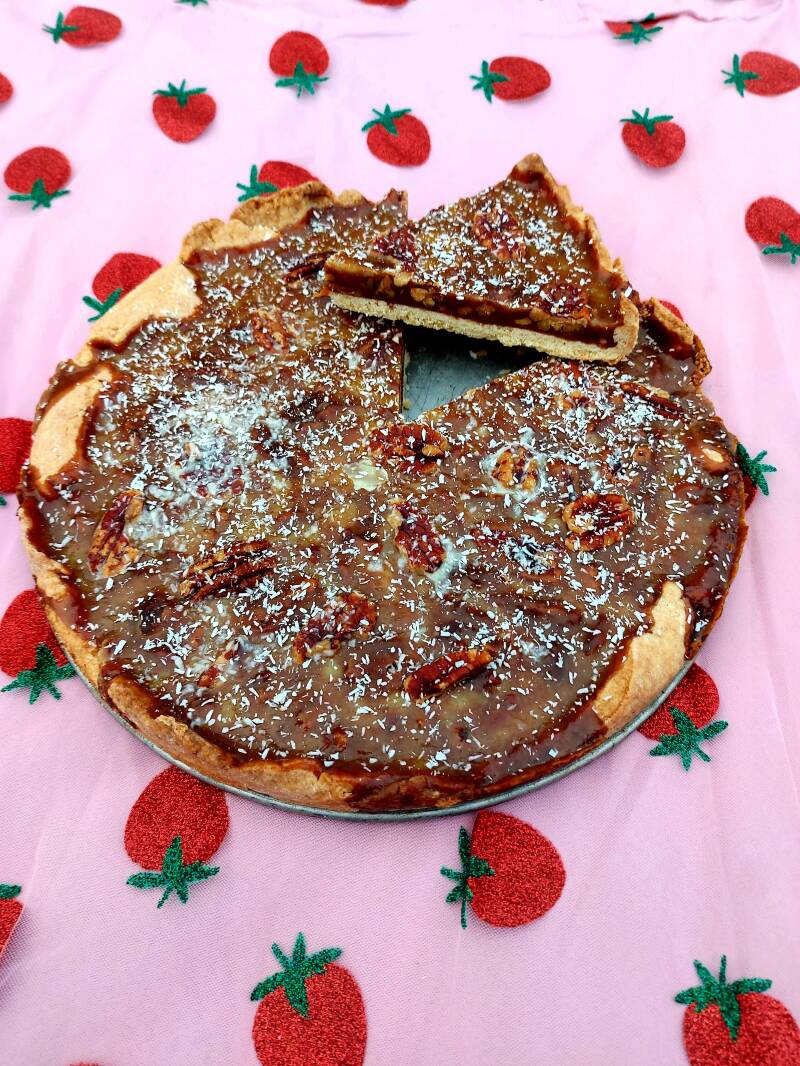 6. Leg de overgebleven pecannoten erop en strooi de kokos over de pie.